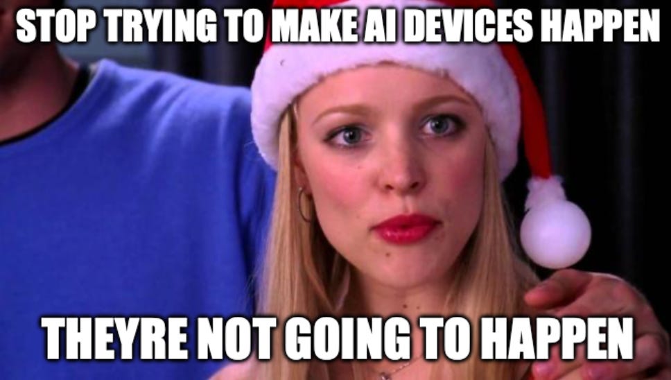 These really just aren’t going to kick off at all. Sam and Jony’s device thingy will be a dud. It will probably look cool and have great marketing videos, but ultimately it won’t do much, probably won’t work very well, and nobody outside of people who bought Vision Pros will buy one. Friend.com had a pretty-clearly fake guerilla ad campaign and ended with most people hating it and nobody buying it; the dude is basically just a Twitter Guy who believes good marketing will overcome bad product. I think they will close shop this year, along with Rabbit, following in the footsteps of Humane